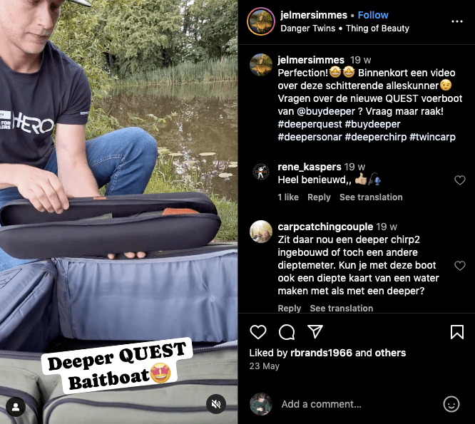 Zum Beispiel kann Influencer-Marketing dabei helfen, ein neues Produkt zu bewerben (Hinweis: Der Inhalt ist auf Englisch), so wie in der Zusammenarbeit zwischen der Angeltechnologie-Marke Deeper Sonar und dem niederländischen Nano-Influencer Jelmer Simmes: