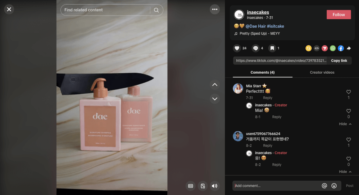 Du kannst Influencer-Marketing nutzen, um die Markenbekanntheit zu steigern, wie es die Haarpflegemarke Dae in einer Kampagne mit der TikTok-Creatorin inaecakes gemacht hat: