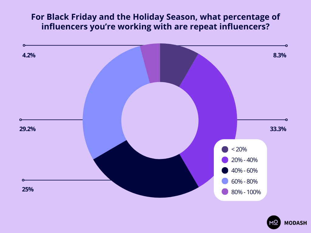 Mehr als ein Drittel der Befragten gab an, dass mindestens 20–40 % ihrer BFCM-Influencer Creator sind, mit denen sie bereits zuvor gearbeitet haben. Bei über der Hälfte liegt dieser Wert eher bei 40–80 %.