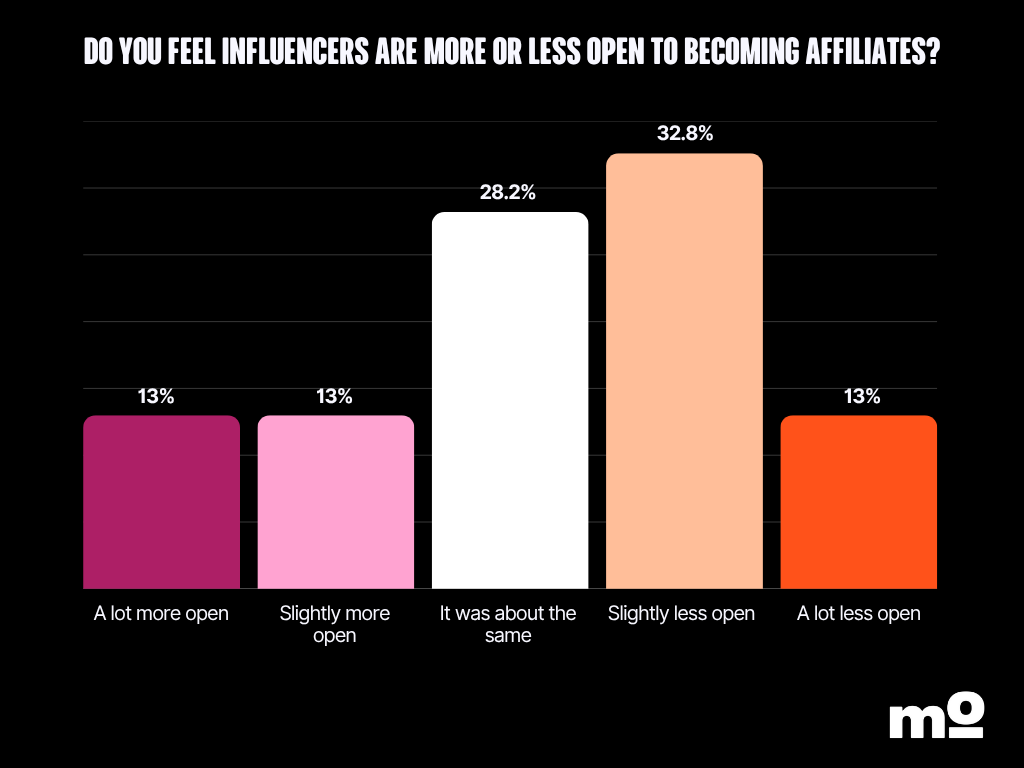 But here’s the other side of the coin: In 2024, more than 63% of marketers said influencers were increasingly open to becoming affiliates. This year, that number dropped to 26%. In fact, over 45% of marketers say influencers are less open to becoming affiliates.