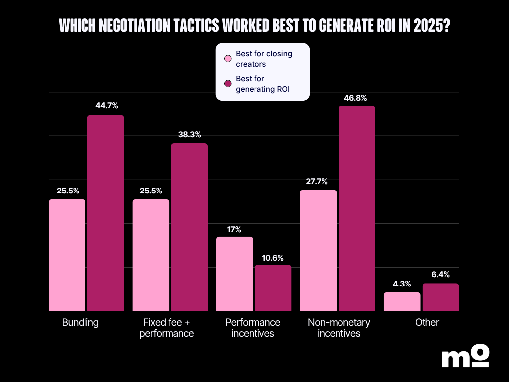 As bundling was the second biggest negotiation tactic according to our survey, it’s not going anywhere for 2026. It’s crucial to be fair in your ask, though – if a creator’s price is out of budget for Instagram Reels, for instance, you can ask them to include a couple of Instagram Stories, but not a new TikTok video.