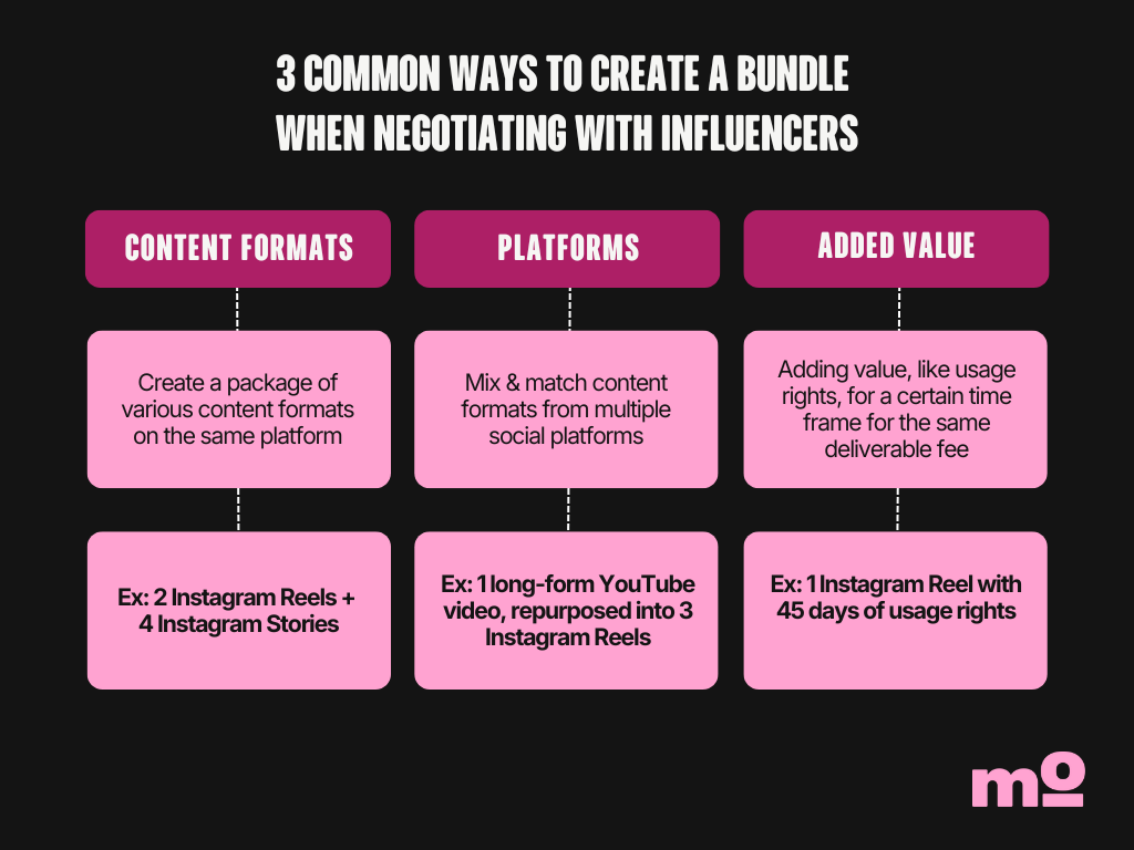 But marketers had one more negotiation tactic up their sleeve in 2025: bundling. An excellent negotiation tactic, bundling allows you to get more influencer content for the same cost. There are three approaches you can take with bundling: