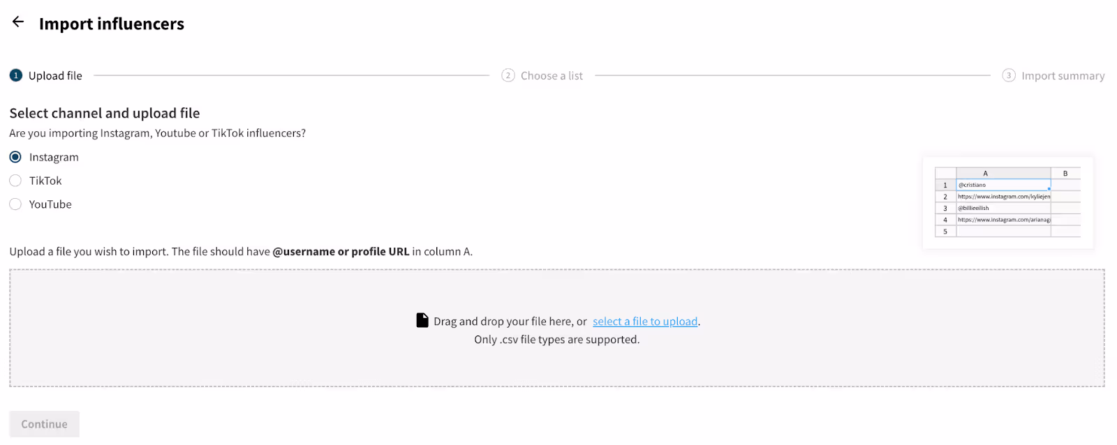 Wenn du früher schon einmal deine Fühler ausgestreckt hast und bereits eine zu prüfende Liste von Influencer:innen besitzt, kannst du diese im CSV-Format mithilfe von ein paar Klicks in Modash importieren.