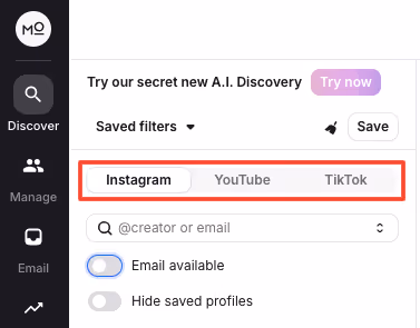 Modash features every public profile on Instagram, YouTube, and TikTok with 1,000+ followers. So the first step is to select the channel you’re targeting with your affiliate marketing efforts.