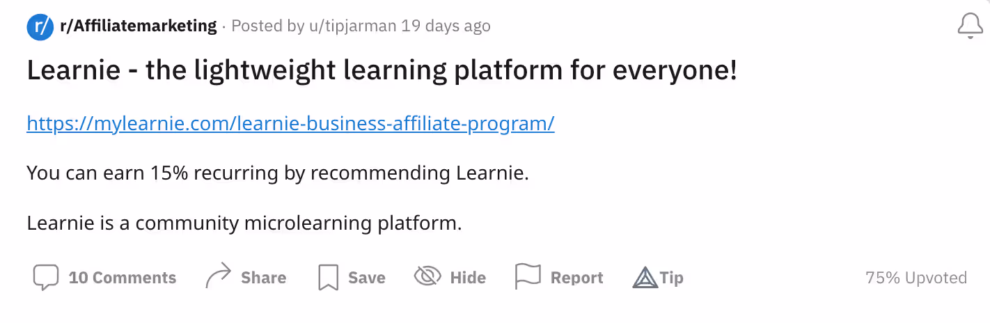 ⚠️Note: Be sure to read the rules of any online communities you join before posting about your program. For instance, r/Affiliatemarketing doesn’t allow unsolicited advertising of affiliate programs; you need to post your offer in the relevant sticky thread instead. Don’t get banned by inadvertently breaching group rules.