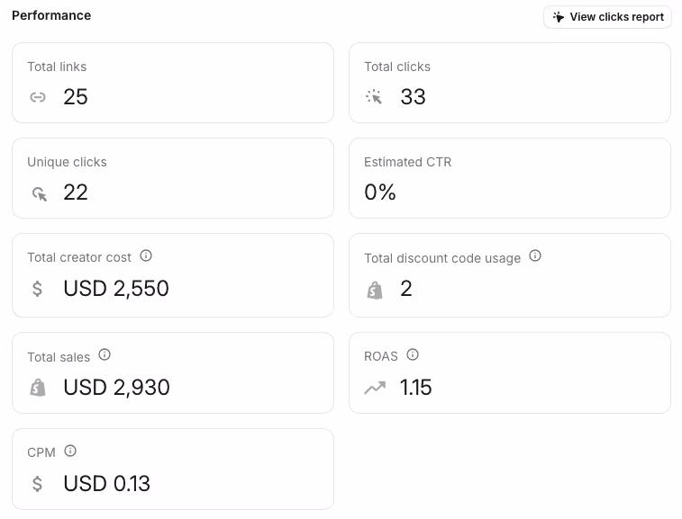 With Modash, you can create UTM links, QR codes, and promo codes in a single platform, then track their usage across all your affiliate partners. And with our Shopify integration, you can view all your data on code redemptions, sales, and revenue on your Modash dashboard.