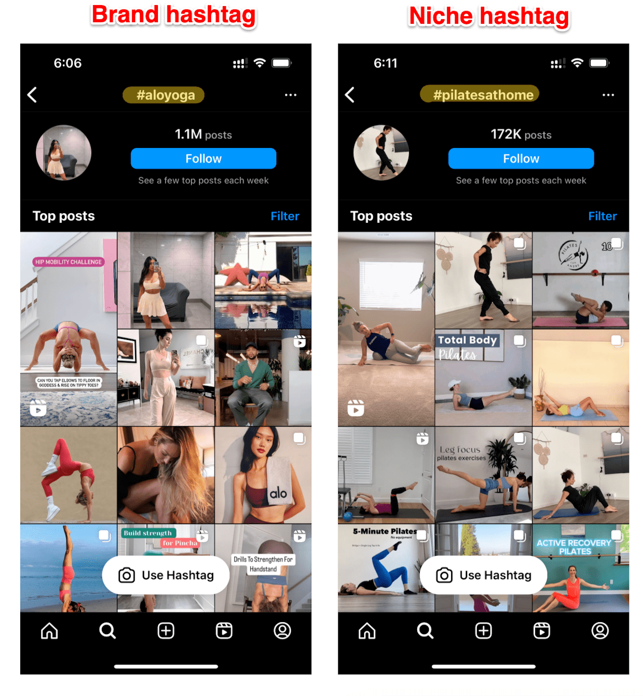 Cualquier hashtag que contenga únicamente el nombre de una marca es un hashtag de marca. Si eres una marca de fitness pequeña, puede que no tengas un hashtag de marca o que el hashtag con el nombre de tu empresa no reciba mucho tráfico, incluso si lo tienes. Busca hashtags de negocios afines que compartan un público objetivo similar. Supongamos que vendes equipo de yoga como Yogamatters. Tu cliente objetivo es idéntico al de Alo Yoga, y su hashtag (#alogyoga) tiene más de 1,1 M de publicaciones. Busca el hashtag de Alo Yoga y puede que encuentres un influencer de fitness que te guste.