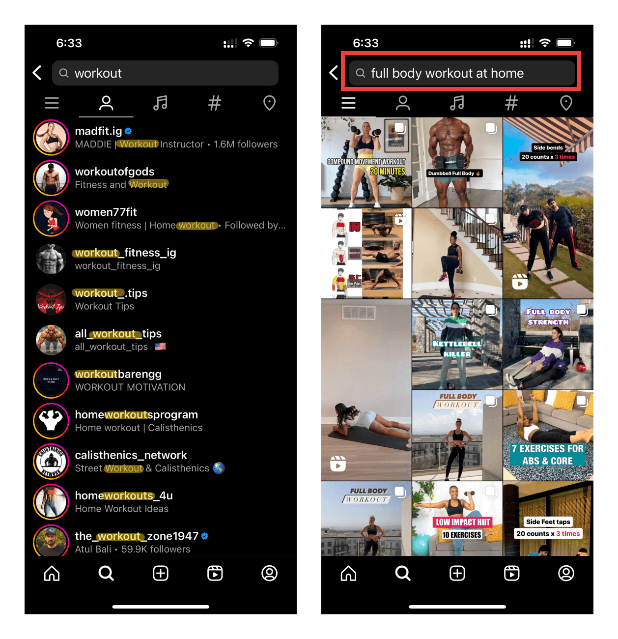Por ejemplo, en Instagram puedes buscar “workout” y aparecerán influencers que tengan fitness en su biografía. Del mismo modo, cuando buscas una palabra clave de cola larga, como “full body workout at home”, aparecerán distintas publicaciones de diferentes creadores.