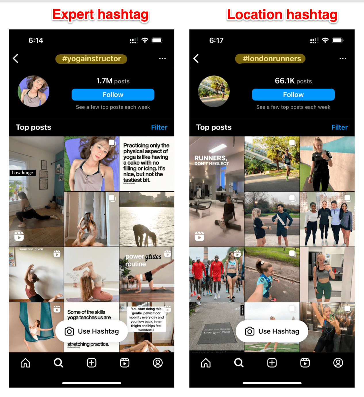 Los hashtags relacionados con una profesión concreta se clasifican como hashtags de expertos. En fitness, estos hashtags podrían ser #fitnessinstructor o #nutritionist. Al igual que con los hashtags de intereses, puedes ser tan general o específico como quieras. En lugar de fitness instructor, por ejemplo, puedes buscar específicamente #yogainstructor. Estos hashtags son los mejores cuando buscas a alguien con credibilidad añadida para asociarse con tu marca.