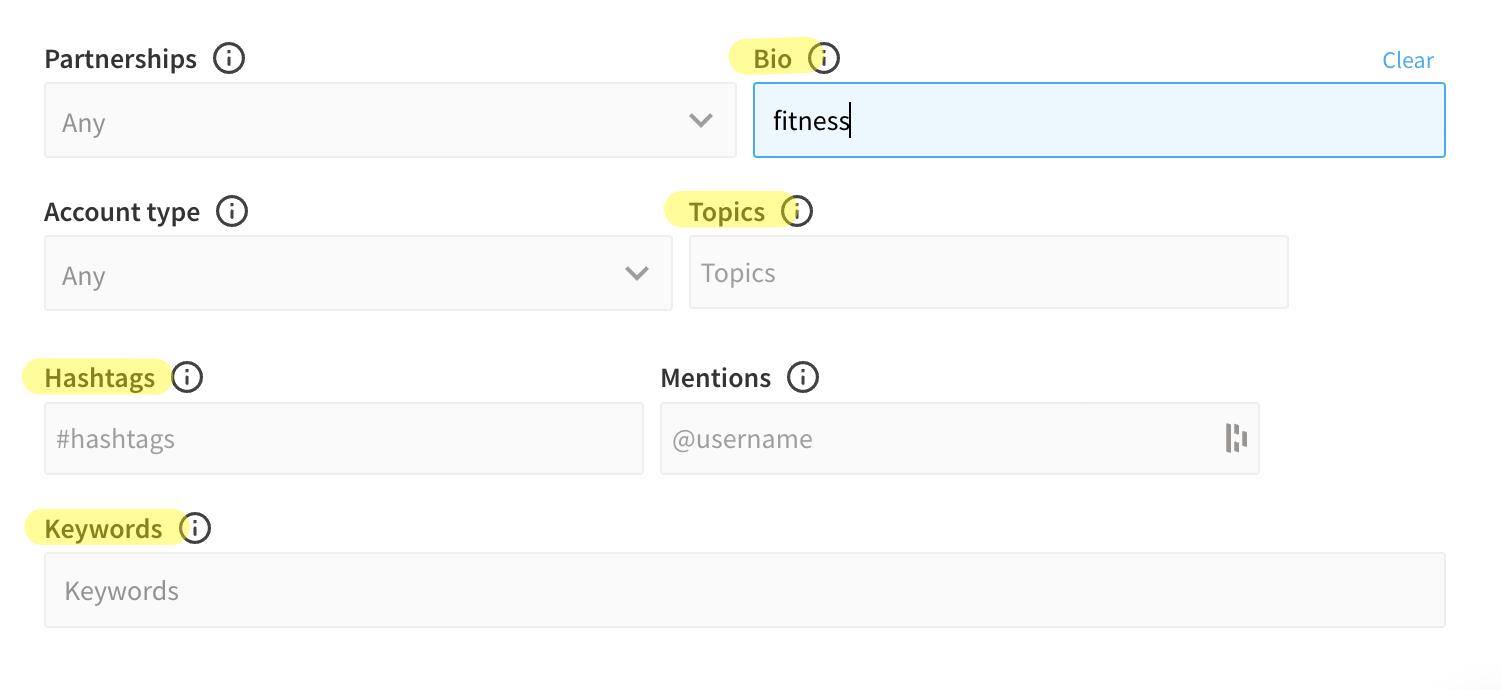 En el caso de los influencers de fitness en particular, te recomiendo añadir filtros de palabras clave, temas, biografía y hashtags relacionados con el fitness uno por uno y revisar los creadores que aparezcan.