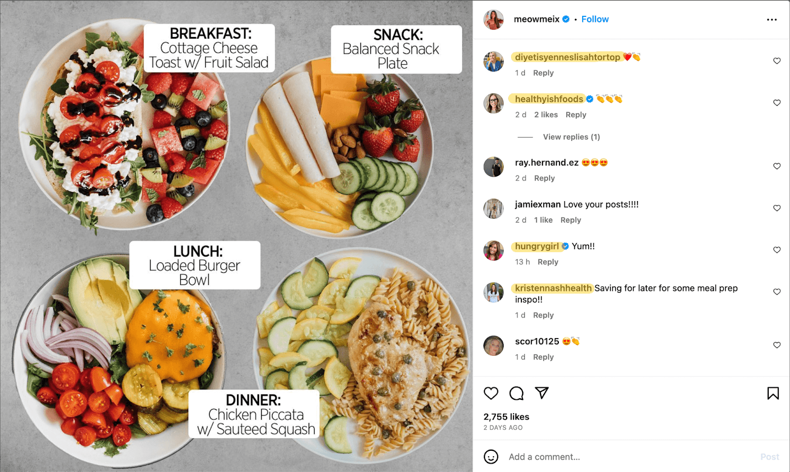 Revisar comentarios es un proceso muy manual, así que no tienes que hacerlo como estrategia inicial. Pero mantente atento cuando veas una publicación de un mega-influencer en tu sector. Los influencers de fitness forman una comunidad muy unida y suelen comentar las publicaciones de los demás —especialmente los influencers más pequeños comentan en las publicaciones de los más grandes—.