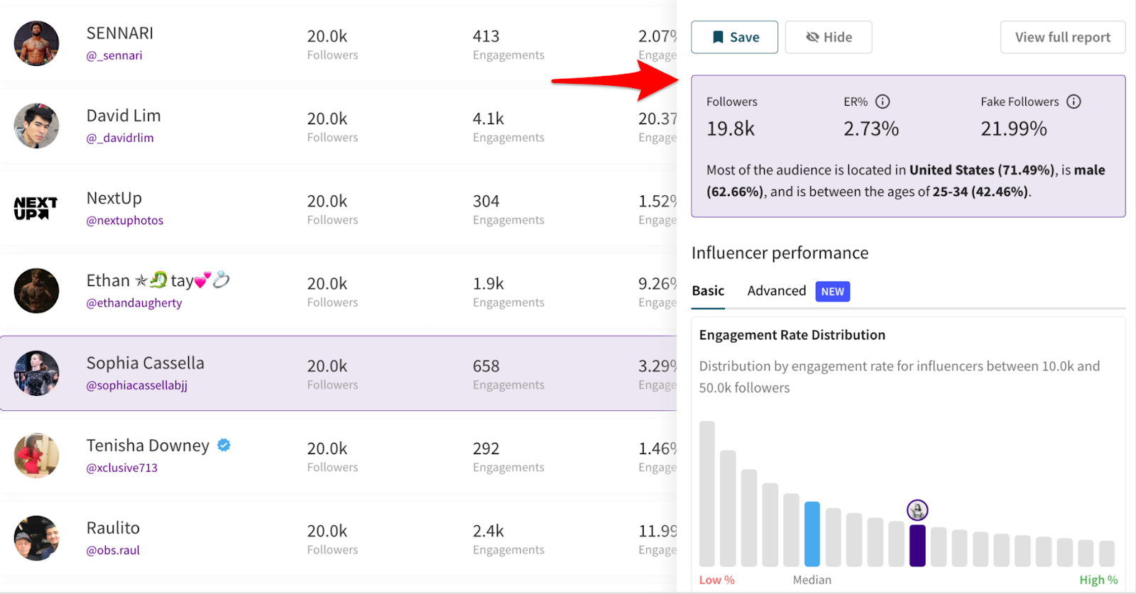 Puedes analizar el perfil de cualquier creador que veas: comprobar su tasa de engagement, métricas de audiencia, rendimiento del contenido y más.