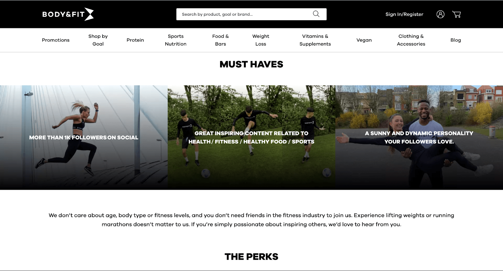 Una forma de mantener todo organizado y profesional en tu programa de embajadores es tener una landing page, como la de Body & Fit. Utilízala para compartir los detalles sobre a quién buscas, cómo pueden postularse y los beneficios que obtendrán a cambio.