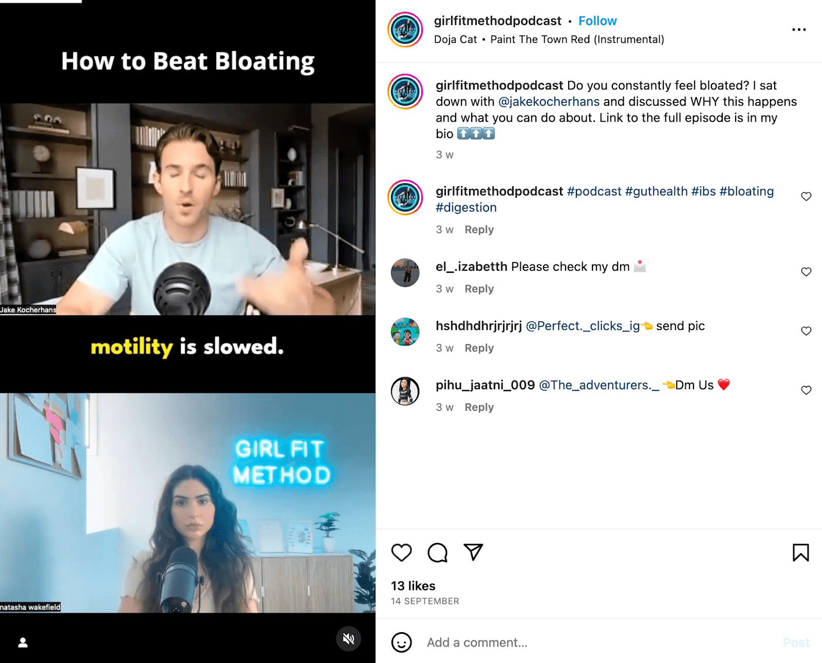 Del mismo modo, el fitness es también un tema candente en los podcasts. Busqué los podcasts más destacados de la industria del fitness y descubrí Girl Fit Method de Natasha Wakefield. Ella es entrenadora de fitness y nutrición para mujeres con un gran número de seguidores, lo que la convierte en la candidata perfecta para ser influencer de fitness. Y la guinda es que a menudo entrevista a otros entusiastas del fitness en su podcast que también son influencers de fitness. Así fue como descubrí a Jake Kocherhans, un influencer de fitness especializado en salud intestinal.