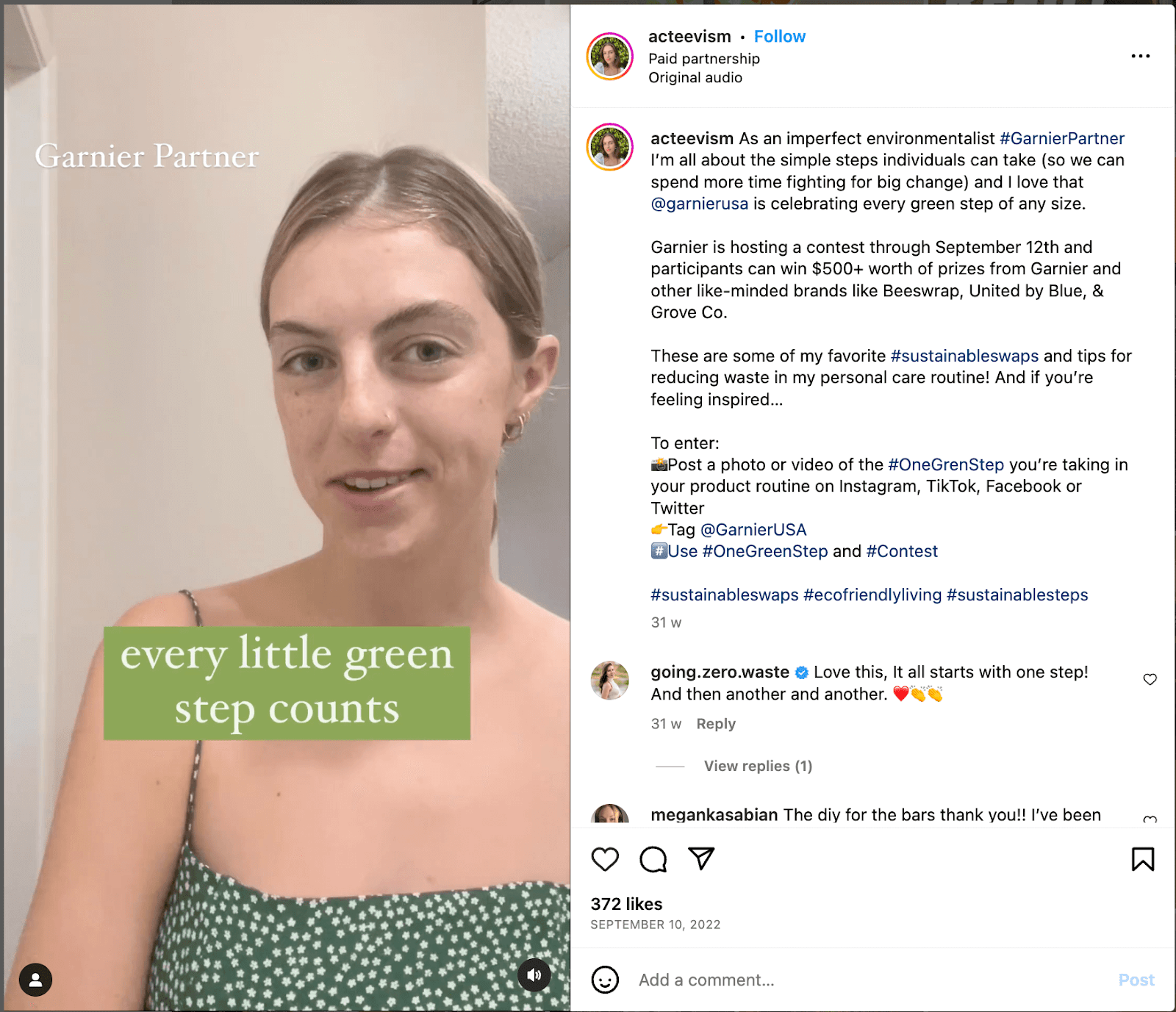 Por ejemplo, si vendes productos capilares sostenibles y libres de crueldad, los microinfluencers de cuidado del cabello son la elección obvia. Pero también puedes asociarte con microcreadores de sostenibilidad y destacar las ventajas ecológicas de tus productos. Esto es precisamente lo que Garnier hizo al asociarse con Megan McSherry, una creadora de moda sostenible, para organizar un sorteo.