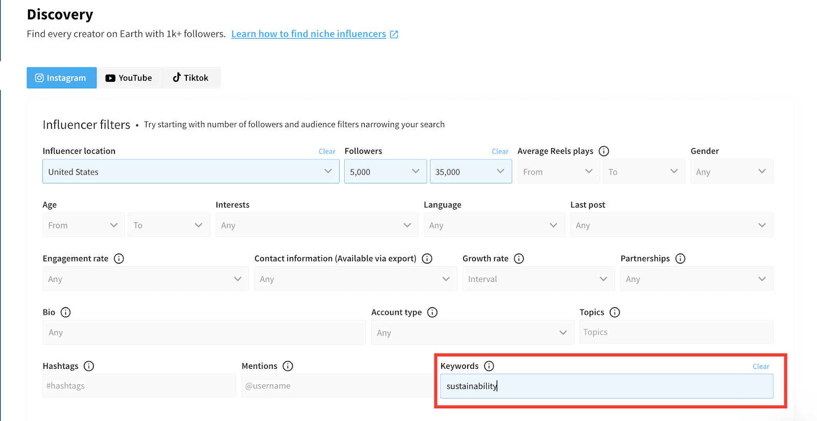 Una vez que tengas clara la vertical adyacente a la que puedes dirigirte, utiliza herramientas de búsqueda de influencers como Modash. Juega con los filtros para encontrar exactamente el tipo de creador que buscas. Si trabajara en Garnier, añadiría la palabra clave “sustainability” en el filtro de biografía y obtendría la lista de más de 25 000 influencers que cumplen mis criterios.