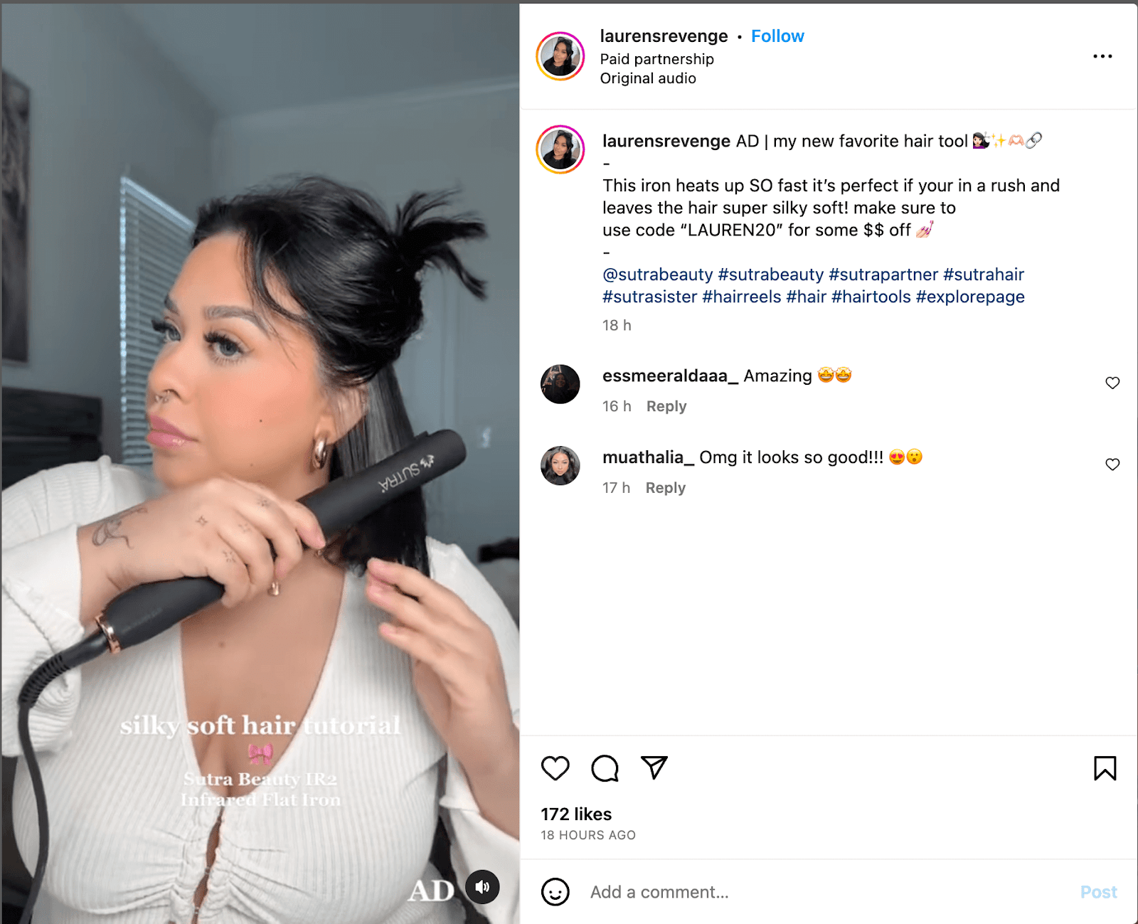 - Si no es así, utiliza enlaces UTM o códigos de descuento personalizados para recopilar datos sobre el tráfico y las ventas que te aporta el microinfluencer. Mira cómo Sutra Beauty ofrece un código de descuento único a su microinfluencer Lauren Elizabeth.