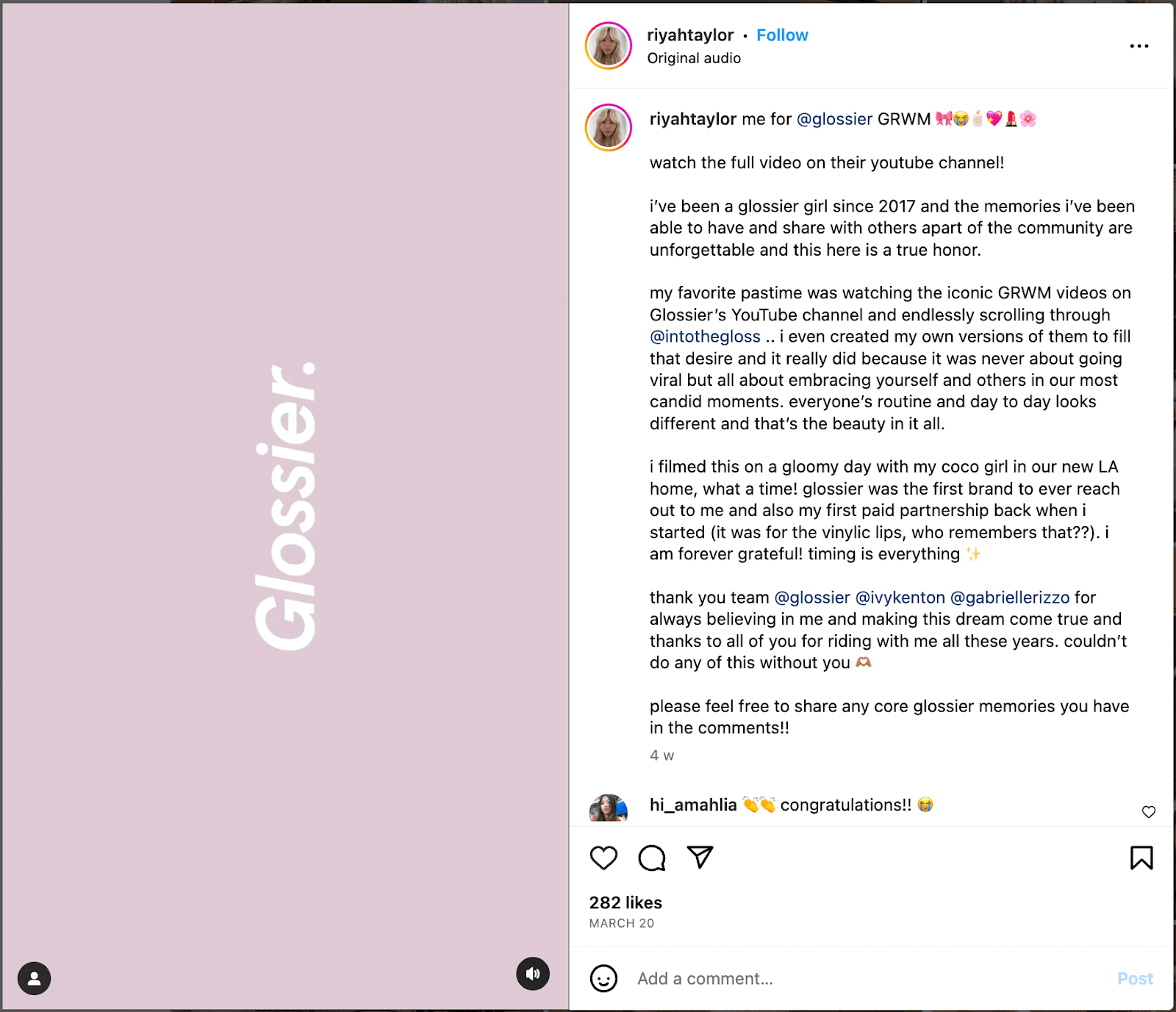 Encontrar un microinfluencer de nicho tiene beneficios evidentes: localizas a alguien que crea contenido para un público objetivo coincidente. Como este creador de nicho se dirige directamente a tu audiencia, goza de confianza y te sitúa ante miles de posibles compradores. Por eso marcas como Glossier colaboran con microinfluencers como Riyah Taylor en la industria de la belleza: son creadores de nicho en el mismo ámbito.