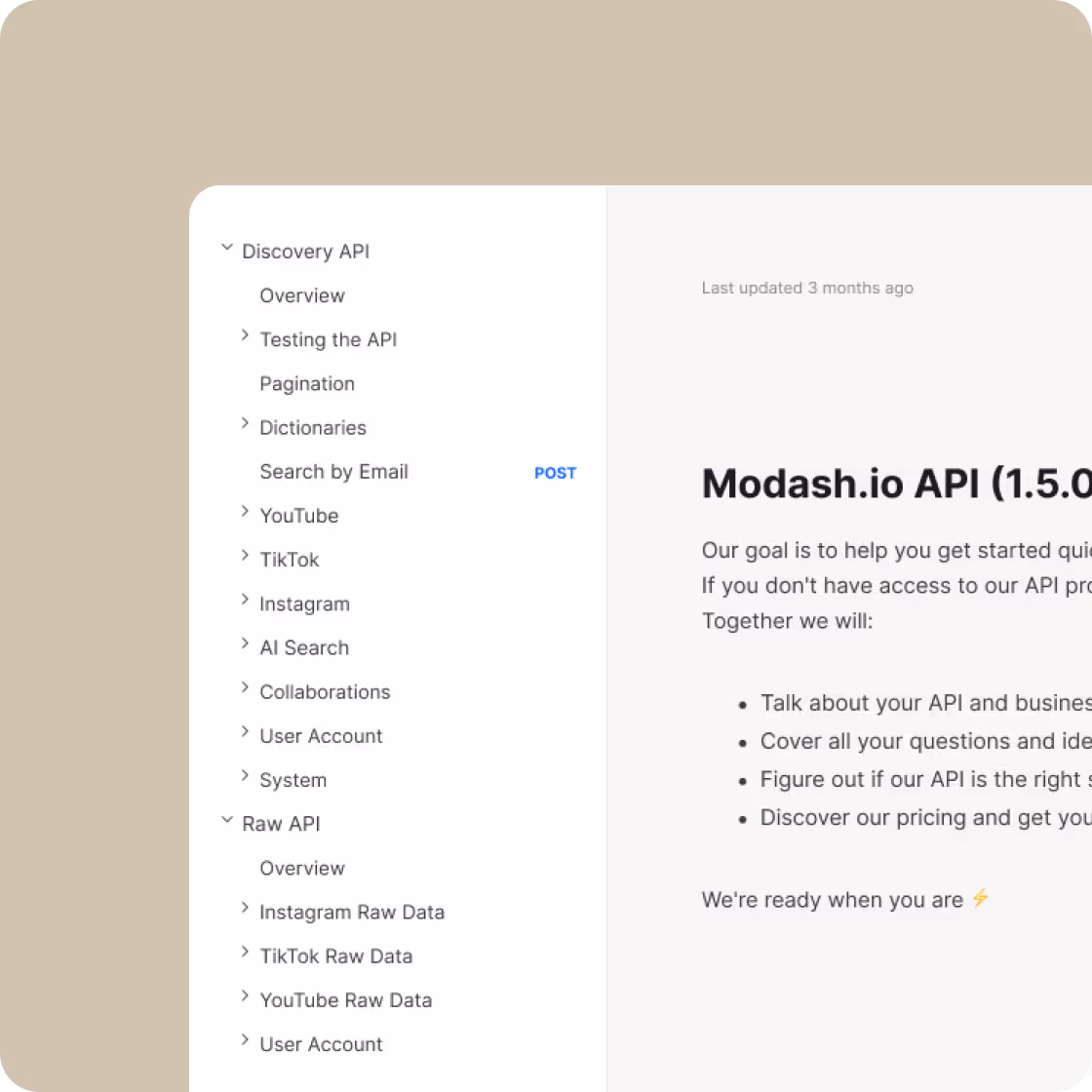 We're very excited to give our users access to such deep and detailed creator data through the Modash API. The creator economy is a vital part of going to market and partnering with Modash means our users can add yet another distribution channel to their own growth strategies.