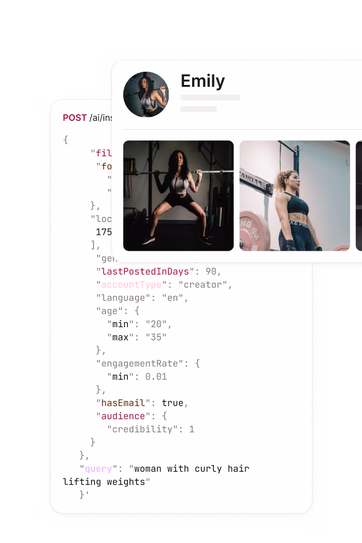 Our API is built for developers to get from an idea to production-ready as quickly as possible. The AI endpoint is currently available to all Discovery API users across Instagram, TikTok, and YouTube.