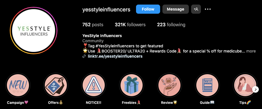 È un modo efficace e a basso sforzo per tenere gli ambassador aggiornati sulle ultime campagne di YesStyle. E con oltre 321.000 follower, è lecito presumere che l'account sia diventato un utile strumento promozionale a sé stante.