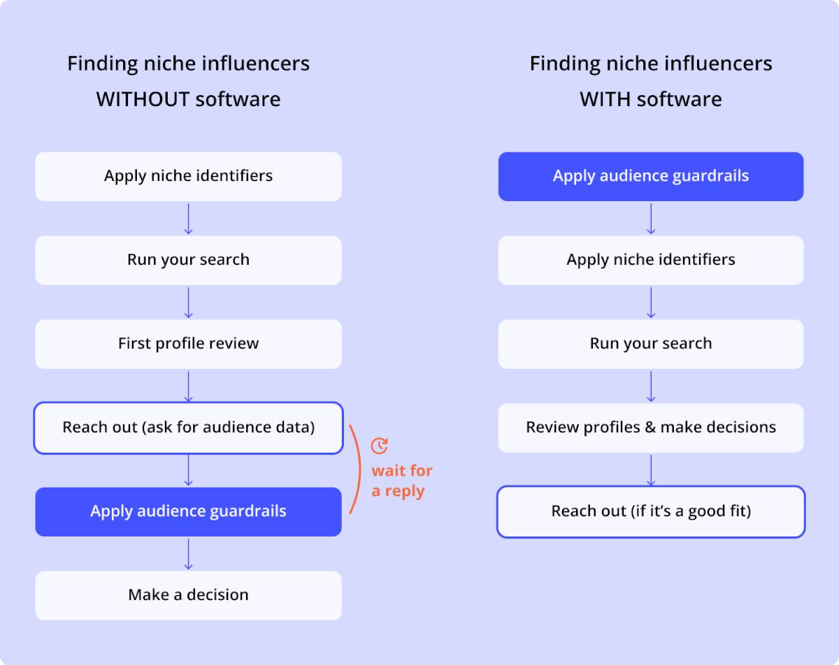 Software lets you apply that audience review step in the very beginning, which cuts out hours of outreach time on profiles that arenât a good fit. That way, youâll only go to the trouble of reaching out & negotiating with influencers when youâre confident itâs a fit. Hereâs a visualization: