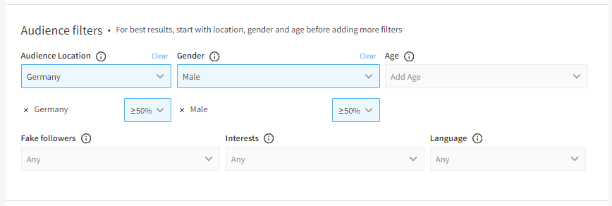 First, you can apply filters for your ideal audience. Our âaudience guardrailsâ. In this example, weâre looking for an audience who is majority male, and located in Germany.