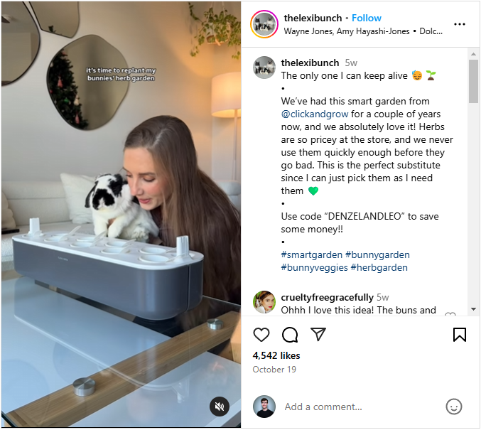 Here's an example of content coming from a pet account, @thelexibunch, with 180k+Â followers. Click &Â Grow's product was a great fit, because the creator could grow veggies & reduce food waste related to feeding her rabbit.