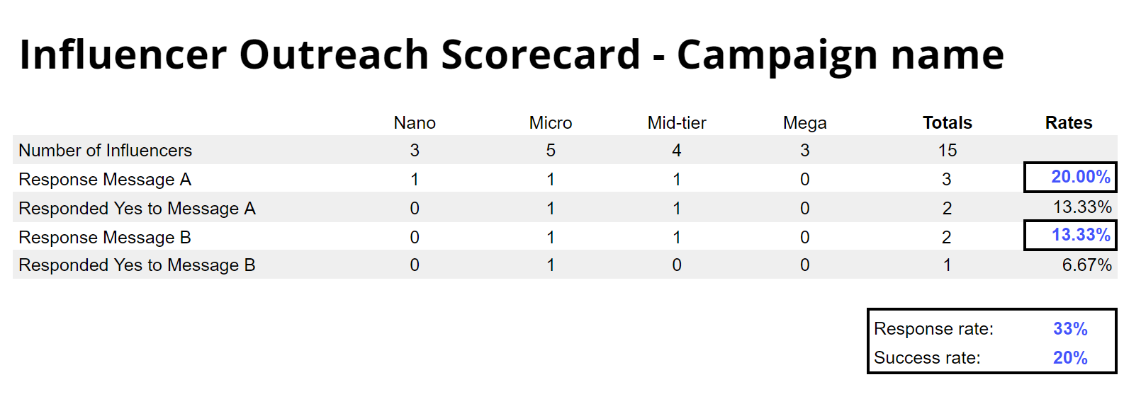As you can see, in this hypothetical campaign, none of our mega influencers responded. And we had most success with Message A and our micro-influencers!Â