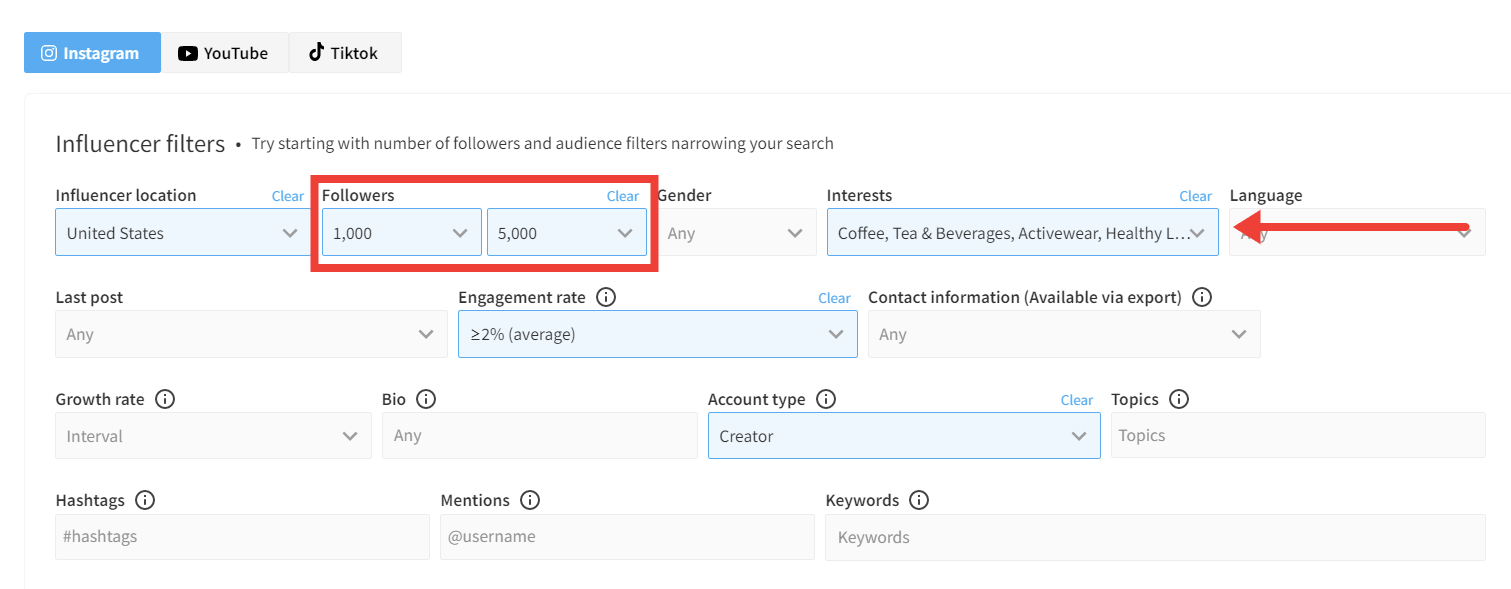 In the screenshot, we filtered by follower size first (1k - 5k) and then added the interests that we think make sense for our shake (coffee, tea, beverages, activewear, healthy living).Â