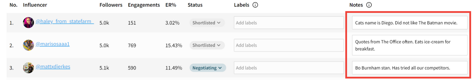 In the screenshot you can see how easy it is to keep track of notes in Modash, where anyone on your team can see the information youâve collected.Â
