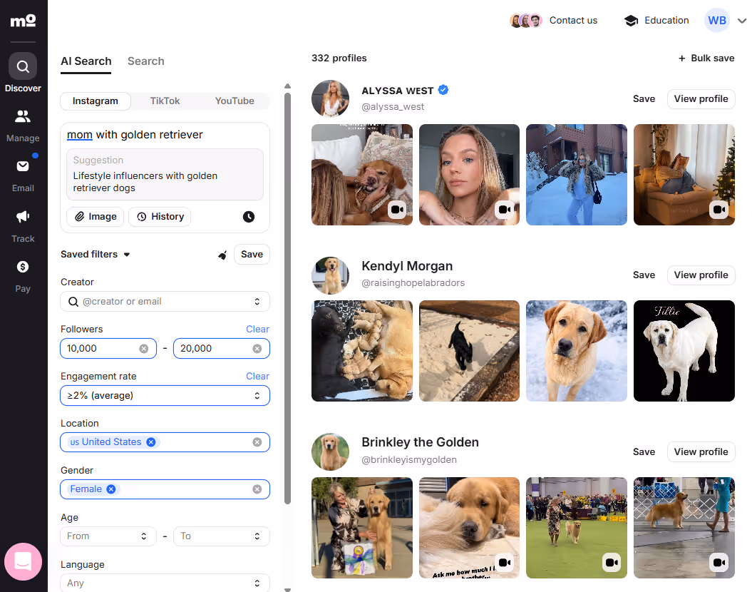 Alternatively, Modash takes all the manual work out of this process. For example, you can search for creators based on their audience demographics, a few keywords, or even use the AI search to find creators based on vibes.