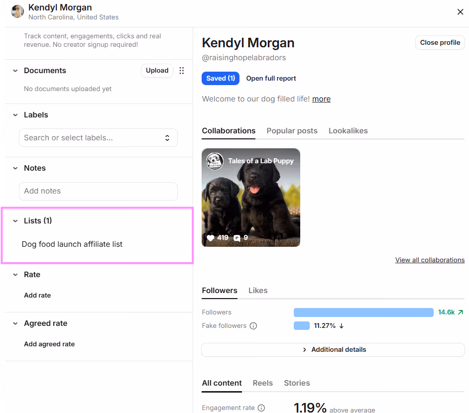 Once you find an affiliate you like, you can click on their profile, check out their audience metrics, engagement rate, most recent posts (including sponsored posts), and add them to a list.