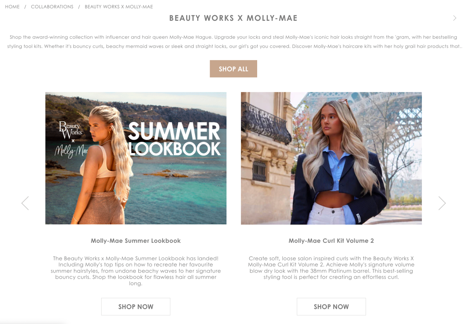Esempio: Molly Mae ha una collezione a suo nome con il marchio di miglioramento dei capelli, Beauty Works. È il volto di tutti i prodotti mostrati in questa collezione e ha anche tutorial sui prodotti che mostrano esattamente come usa gli articoli elencati.