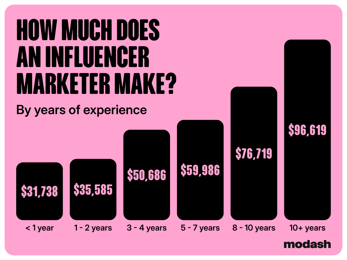 In years 8-10, the biggest salary jump happens: $16K. This is often the point for influencer marketers to either specialize and niche down or move into leadership roles.
