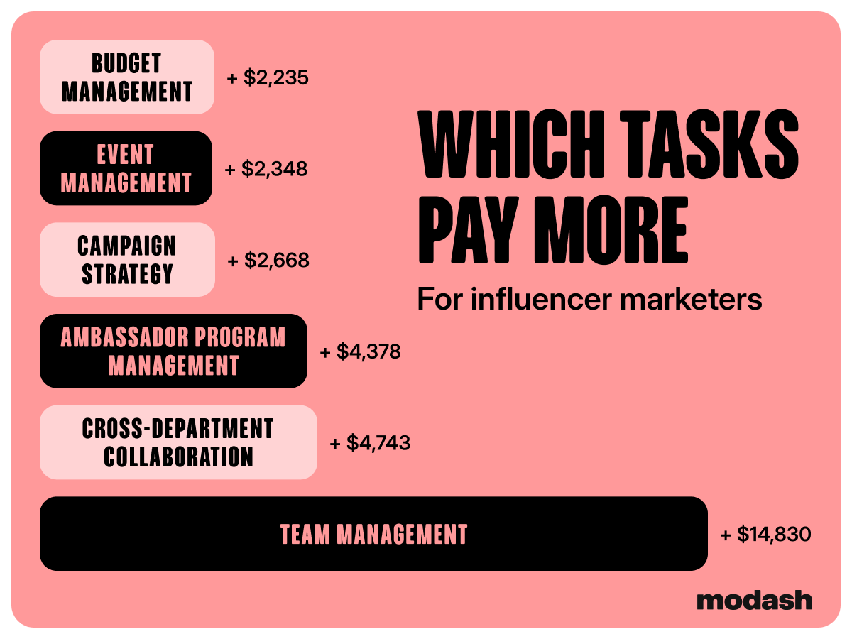 Marketers are already expected to own the influencer lifecycle from A to Z – but when they own other things, like the budget, strategy, and collaboration with other departments, this is where they see the biggest salary increases.