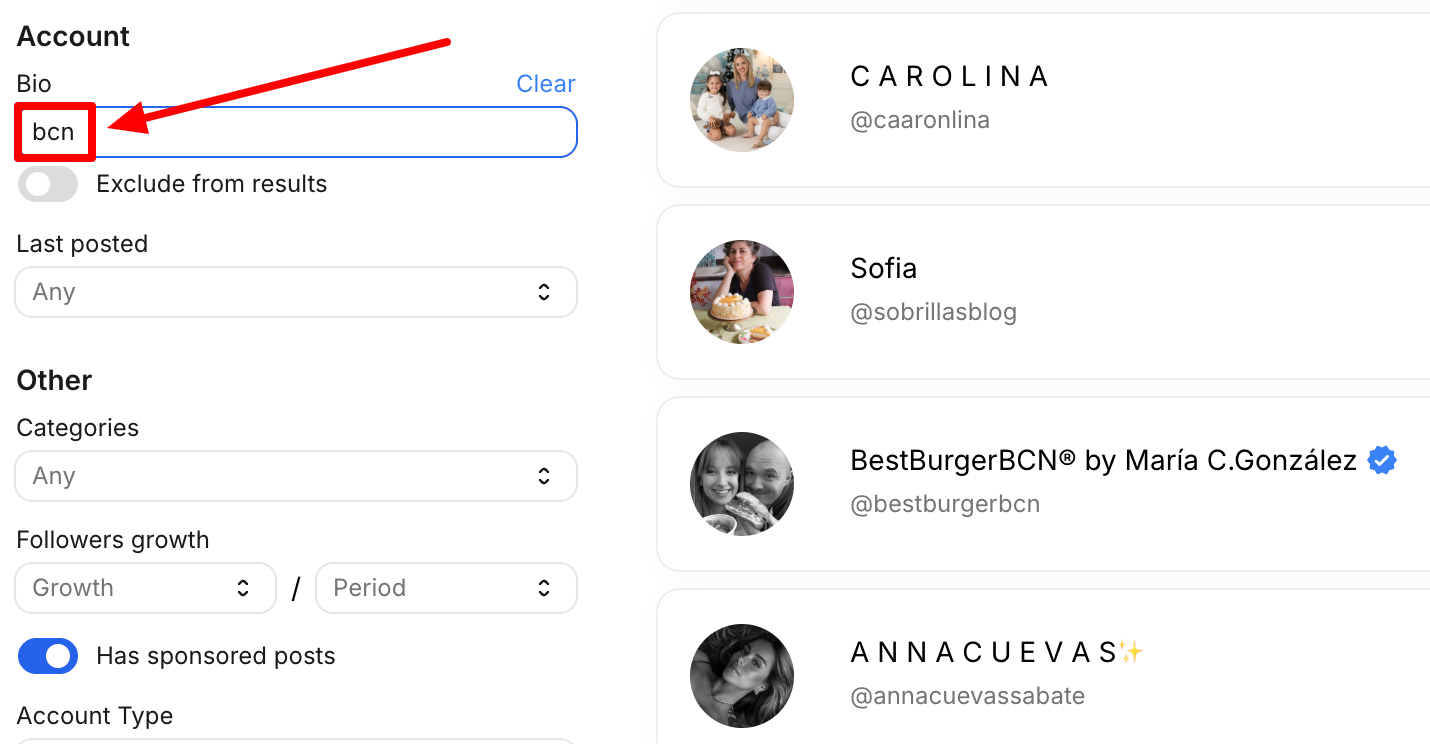 💡 Pro tip: Piia relies on Modash’s audience and creator location filters to track down geographically relevant influencers. As well as this, she recommends using our bio search feature to track down influencers using location-specific terms, like “BCN” in Barcelona.