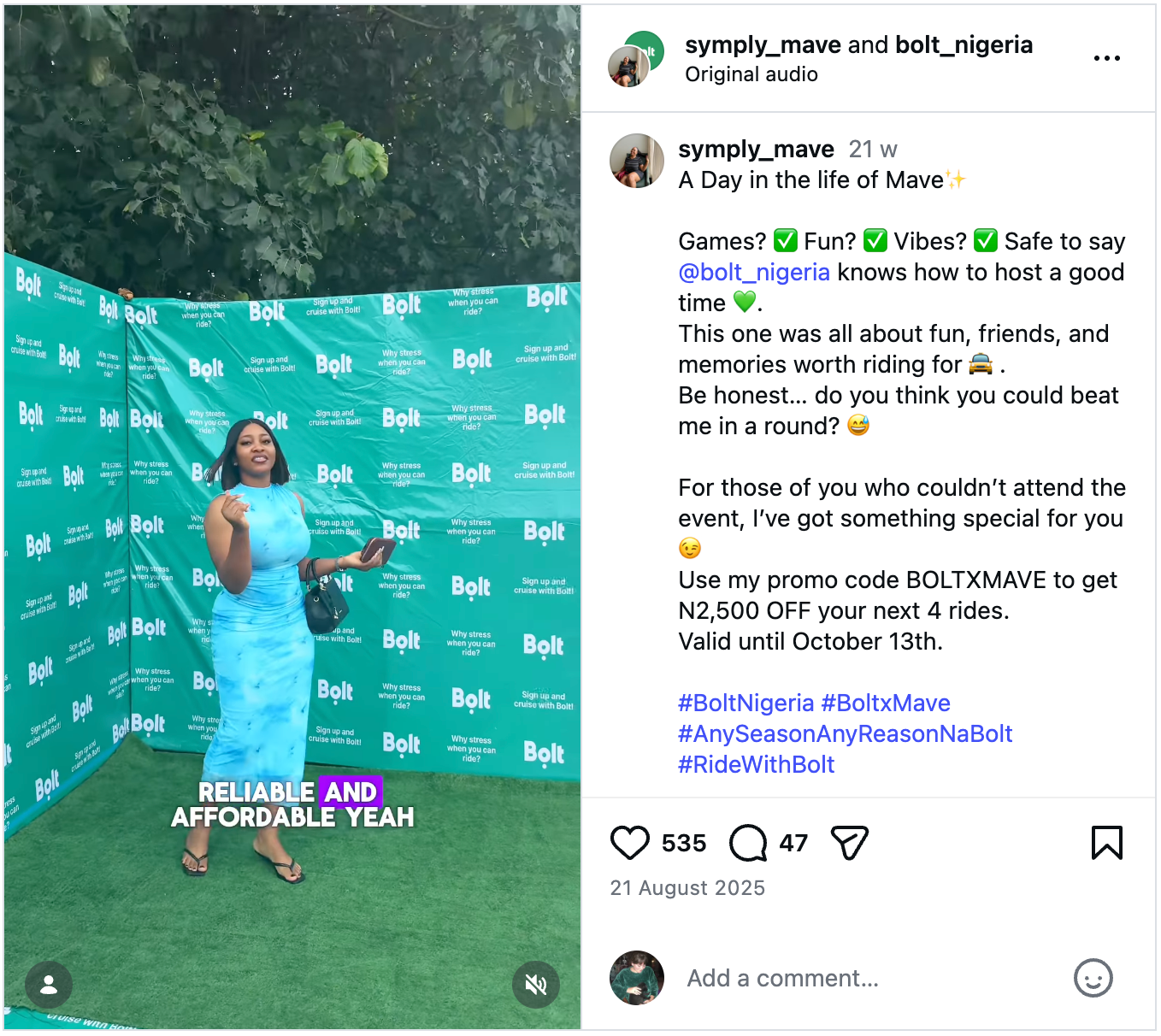 …whereas Symply Mave, a tier #2-level influencer, leveraged her loyal following to promote Bolt by sharing details of a Bolt event she attended – along with a limited-time discount code…