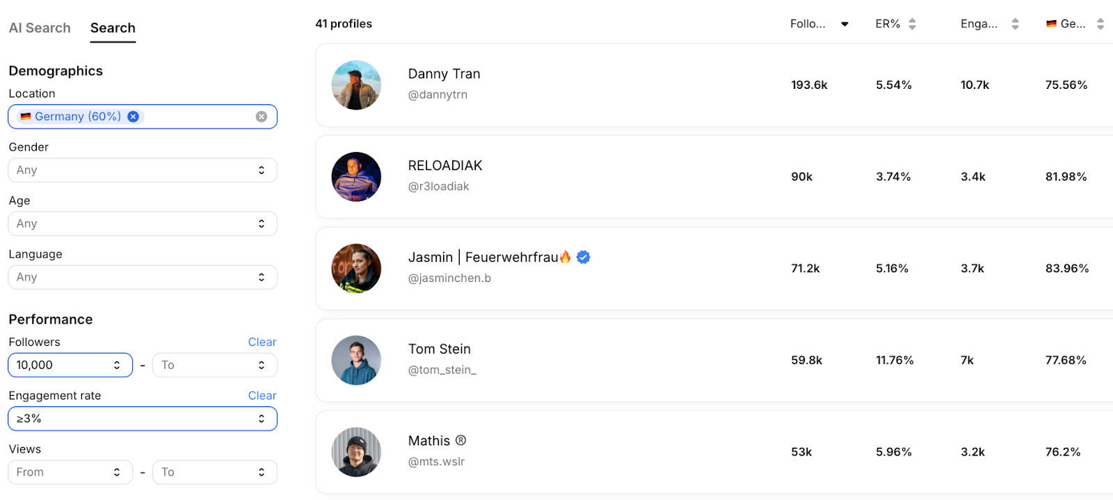 Searches for those higher-tier collaborations begin in Modash, which has a database of every influencer on Instagram, TikTok, and YouTube with 1,000+ followers – that’s 350+ million influencers. Valeriia Chemerys, Head of Media Partnerships at Deeper, explains that she and her team narrow down their search using filters like:
