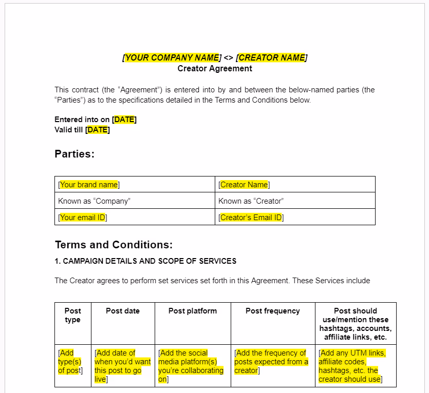 👉 If you need an influencer contract template ASAP, here it is. Click on “File” and “Make a copy” to edit it and send it to your influencer partners. You need to fill everything marked in yellow with your brand’s info.
