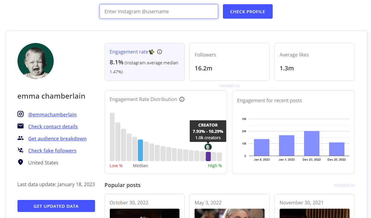 Se utilizzi uno strumento di analisi degli influencer come Modash, puoi controllare i dati del pubblico ancora prima di contattarli. E/o puoi verificare ciò che ti dicono. Puoi scoprire: