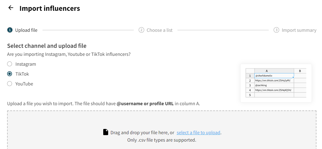 이미 TikTok 계정 목록이 있다면 Modash의 ‘Lists & contact details’ 섹션으로 이동하세요. 그곳에서 .csv 파일을 가져오는 옵션을 볼 수 있습니다.