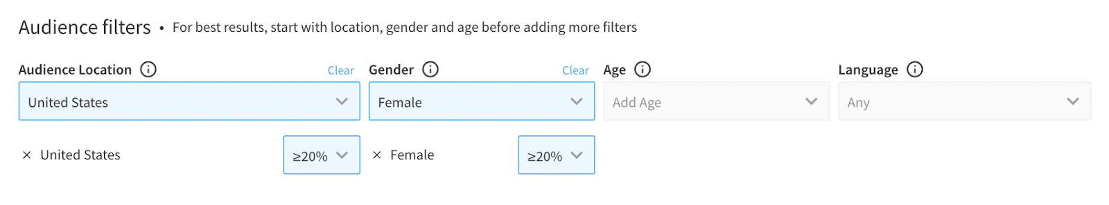 검색을 더 정교하게 하기 위해 팔로워의 지역, 성별, 연령, 언어를 지정하는 청중 필터를 추가할 수 있습니다. 해당 속성을 가진 청중의 비율도 설정할 수 있습니다. 이 예시에서는 최소 20%로 설정했습니다.