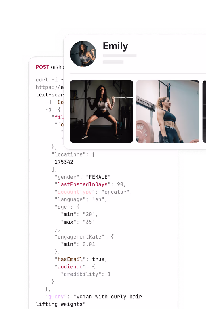 Equip your platform with AI-powered search and let your users discover creators by aesthetic, content, audience, and context across our database of Instagram, TikTok, and YouTube influencers.