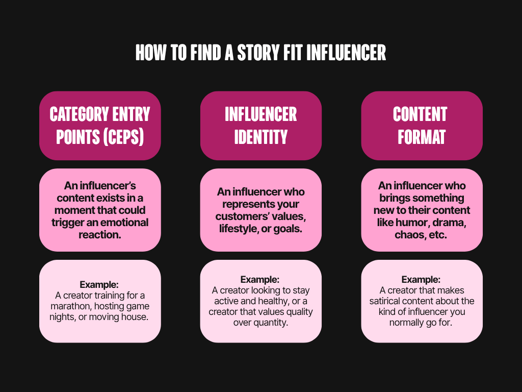 A story fit influencer is a creator who can tell your brand’s story in a way that feels authentic to them, and will resonate with their (read: your) audience.