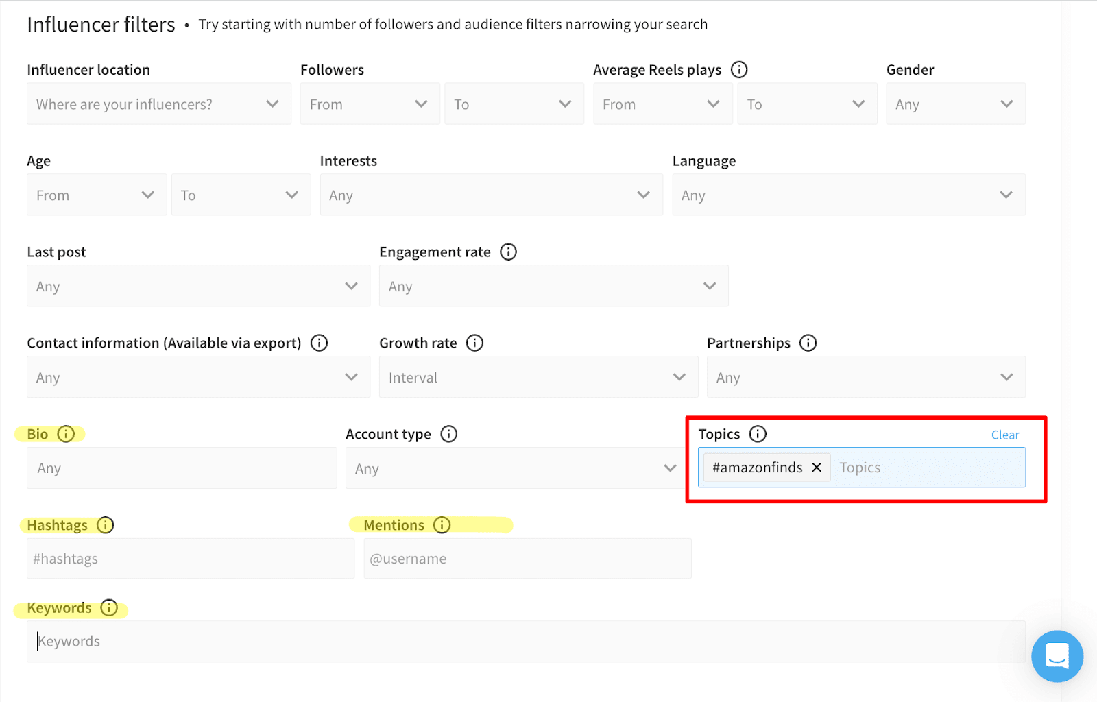 - Aby szukać konkretnie influencerów Amazon, zastosuj filtry związane z Amazonem w biogramie, tematach, hashtagach i słowach kluczowych. Na przykład w filtrach biogramu i hashtagów wyszukaj „Amazon Finds” lub „Amazon Deals”, a w filtrze wzmianek możesz wpisać „@amazon” lub „@amazonfashion” — w zależności od swojej niszy. Gdy znajdziesz kilku influencerów Amazon, sprawdź, jakich słów kluczowych lub kont używają, i wyszukaj je w Modash, aby znaleźć podobnych twórców.