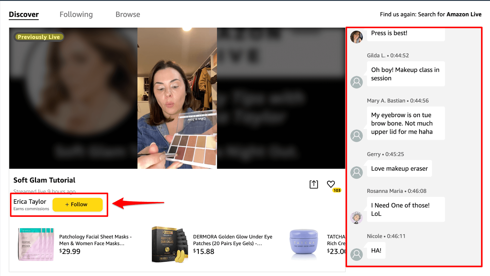1. Amazon Live: tutaj znajdziesz influencerów Amazon prowadzących transmisje na żywo, podczas których pokazują swoje ulubione produkty z Amazon. Oglądający mogą również komentować.