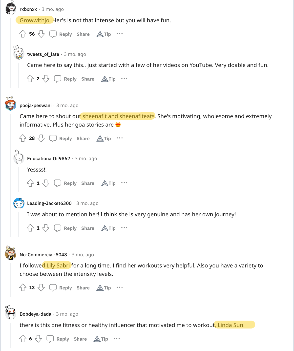 W branży wartej miliardy, takiej jak fitness, istnieją niezliczone społeczności i podcasty. Wykorzystaj je, aby odkryć lubianych twórców. Na przykład wpisałem w Google „home workout fitness creators reddit” i znalazłem mnóstwo różnych wątków na ten temat. Ludzie dzielą się tu nieocenzurowanymi opiniami, które pomogą Ci nie tylko znaleźć lubianego twórcę, ale też sprawdzić, czy wybrany influencer nie ma złej reputacji w społeczności fitness.