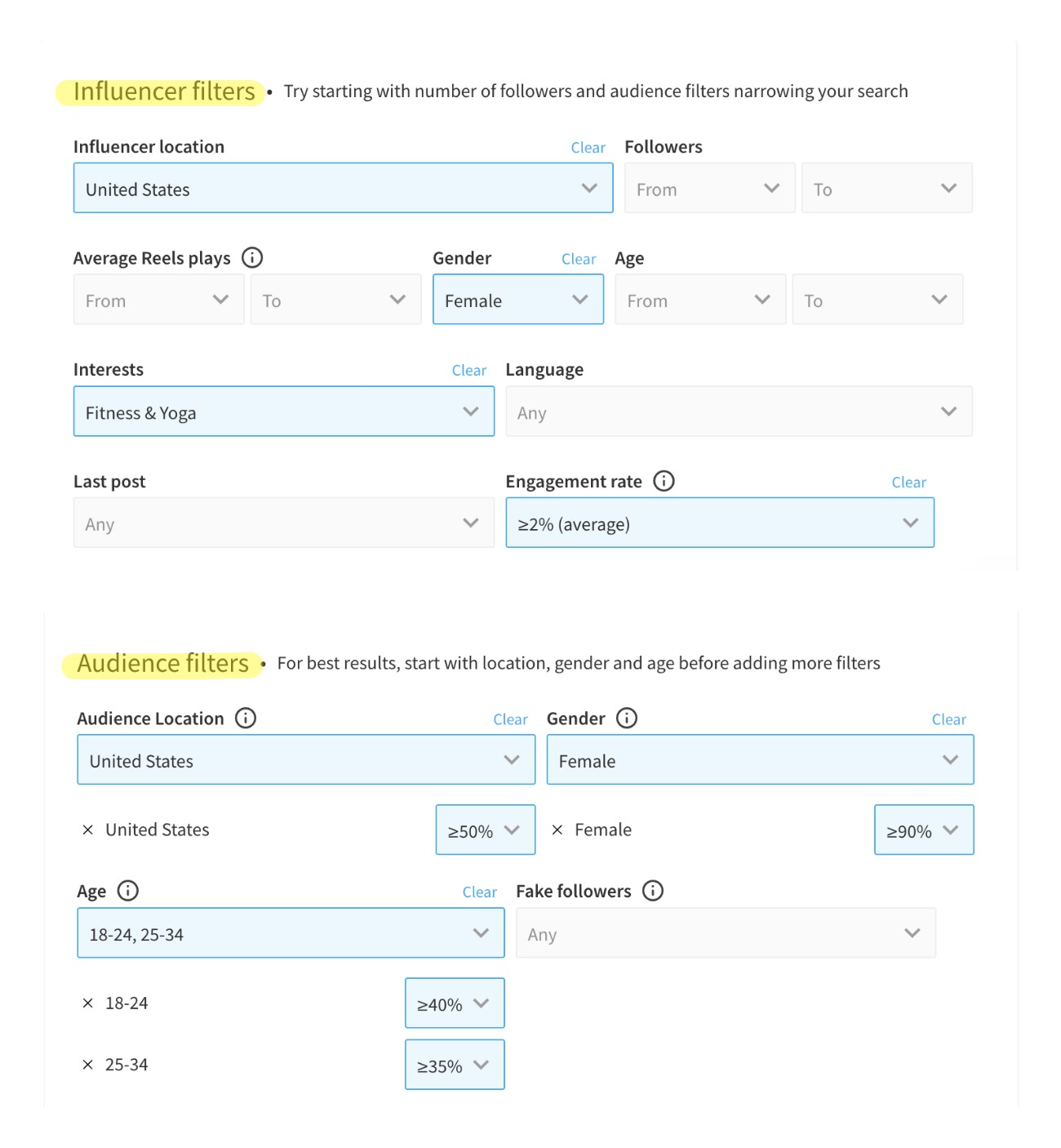 - Pierwsze określają, jaki powinien być idealny influencer. Załóżmy, że chcesz współpracować z kobietą z USA, zainteresowaną fitnessem i mającą co najmniej 2% wskaźnika zaangażowania. To będą Twoje filtry influencera.