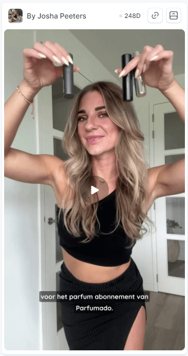 A Parfumado é um serviço de subscrição que ajuda os consumidores a descobrir novas fragrâncias e produtos de beleza favoritos. Eles utilizam regularmente conteúdos de influencers em campanhas de whitelisting, como neste exemplo de uma campanha de 30 dias com a influencer de lifestyle holandesa Josha Peeters.